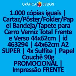 1.000 cópias iguais | Cartaz/Pôster/Folder/Papel Bandeja/Tapete para Carro Verniz Total Frente e Verso 44x62cm | id 463294 | 44x62cm A2 SUPER | 4x Sulfite | Papel Couchê 90g PROMOCIONAL | Impressão FRENTE Colorida apenas | 4x0 cores